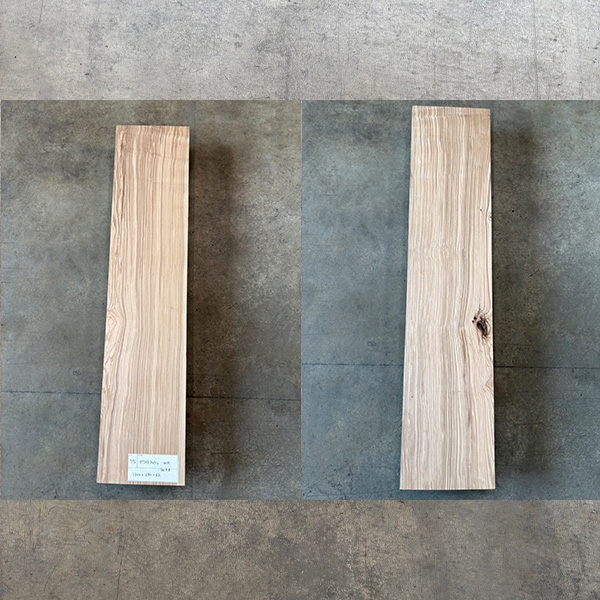 ほぼ白色、心材は灰褐色~淡い黄褐色を呈しており、辺心材の境目は明瞭。