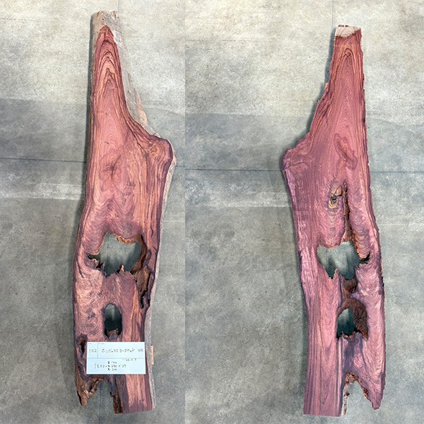 心材は赤褐色ないし紫色を帯びた褐色、辺材は心材より色が薄く、黄色味がかっている。