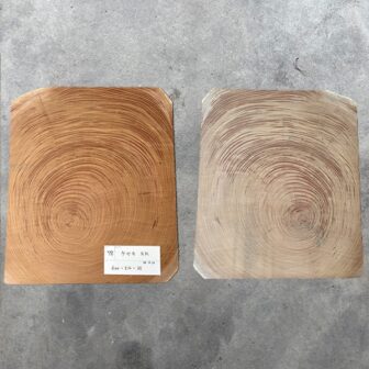 サイズ600×510×35 ㎜産地日本特徴片耳白輪切り サンダー仕上げ価格17,000円(税込・送料別)淡い黄褐色、心材は黄褐色~黄赤褐色を帯びており、辺心材の境目…